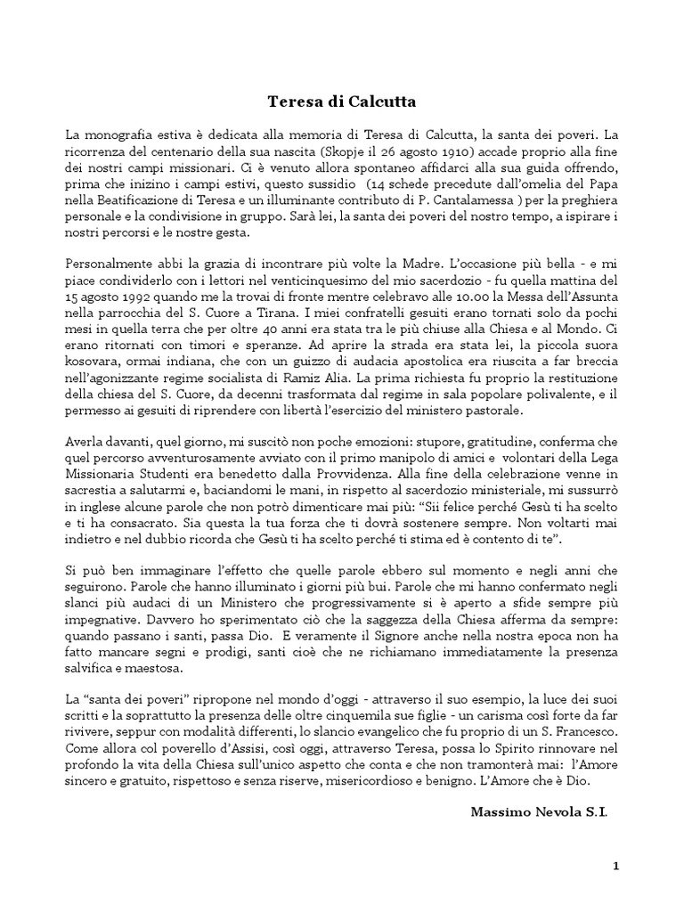 PDF Lettera a madre Teresa di Calcutta doc 117 - amicidivittorina.it Lettera a madre Teresa di Calcutta - Doc. 117 S. Maria degli Angeli Mantova, 2-8-80 Carissima Rev.da Madre Teresa , ho scritto a Calcutta e la Madre Frederick mi ha risposto con molta carità di scrivere a Roma, perché forse Lei sarebbe stata lì al Celio. In Maggio sono anche venuta a pregare con le Sue Suore a Roma, al Noviziato e al