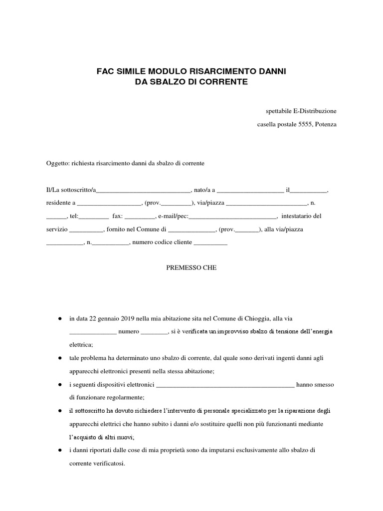 Lettera Risarcimento Danni Appartamento - Come Scrivere ... In questa guida spieghiamo come scrivere una lettera di risarcimento danni appartamento e proponiamo un fac simile di lettera di risarcimento danni appartamento da utilizzare come esempio. Il modello editabile può essere scaricato sul proprio computer e compilato inserendo le informazioni mancanti nel modo spiegato all’interno della guida. Indice modulo richiesta danni a Compagnia responsabile Oggetto: Richiesta di risarcimento ai sensi degli articoli 145 e 148 del Codice delle. Assicurazioni private (Decreto Legislativo 209 del 07/09/2005).1 page
