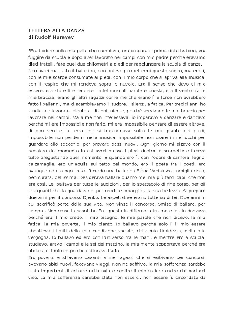 Lettera Alla Danza | PDF - Scribd LETTERA ALLA DANZA. di Rudolf Nureyev "Era lodore della mia pelle che cambiava, era prepararsi prima della lezione, era fuggire da scuola e dopo aver lavorato nei campi con mio padre perch eravamo dieci fratelli, fare quei due chilometri a piedi per raggiungere la scuola di danza. Non avrei mai fatto il ballerino, non potevo permettermi questo sogno, ma ero l, con le mie scarpe consumate ai ...